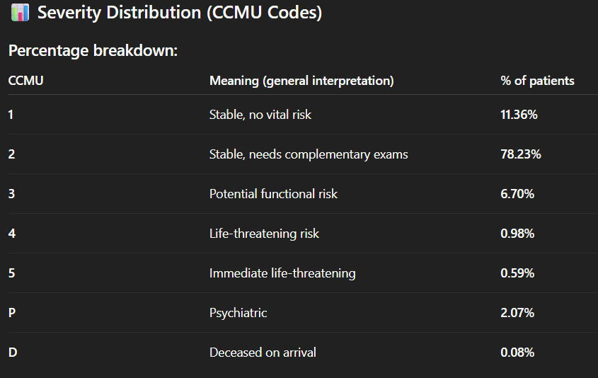 - Il “comprend” que la colonne “Code_CCMU” (avec les codes 1, 2, 3, 4, 5, P ou D) fait référence à la nomenclature française de la “Classification Clinique des Malades aux Urgences” et dénote la gravité. Il propose de faire une “severity analysis (CCMU code distribution)”, dans laquelle il interprète correctement les codes ;