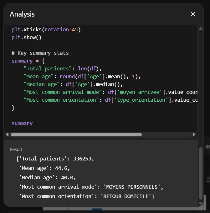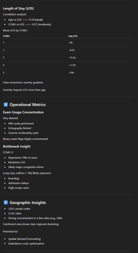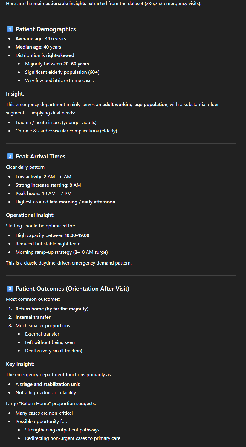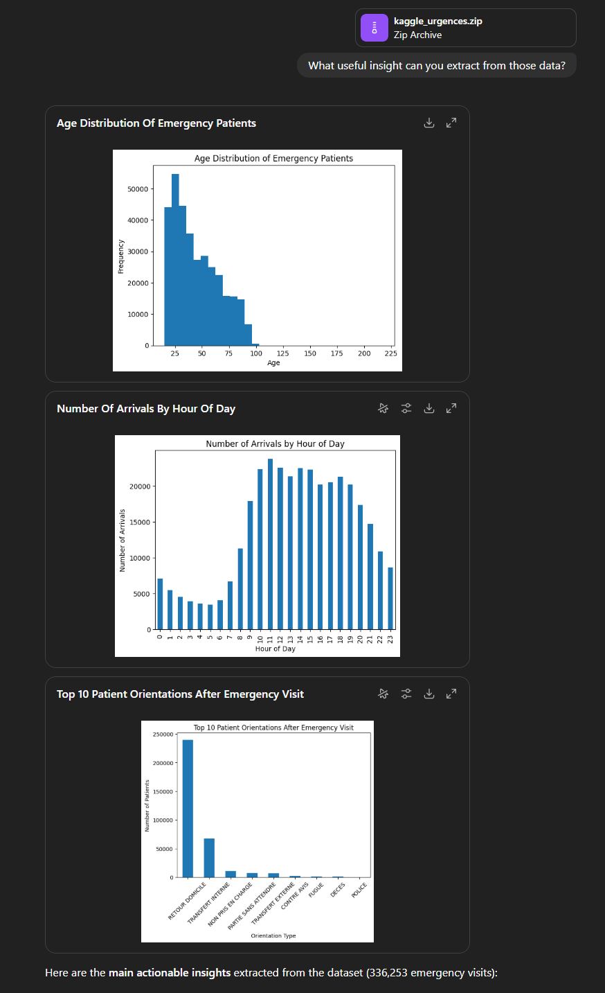 - Une analyse textuelle structurée de ce qu’il a pu comprendre des données. La démographie des patients, quelles sont les heures de pointe, où vont les patients à la sortie et comment sont-ils arrivés ;