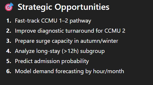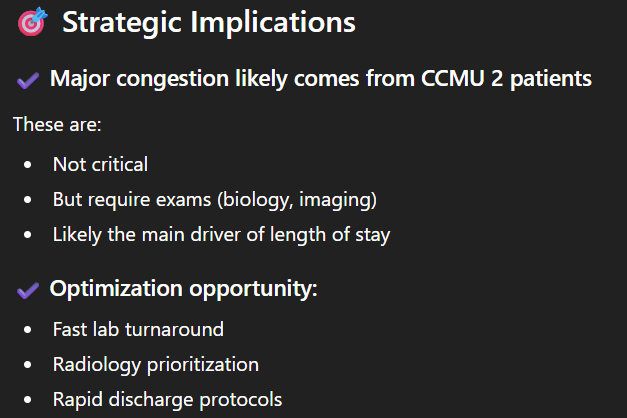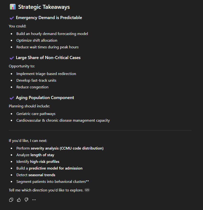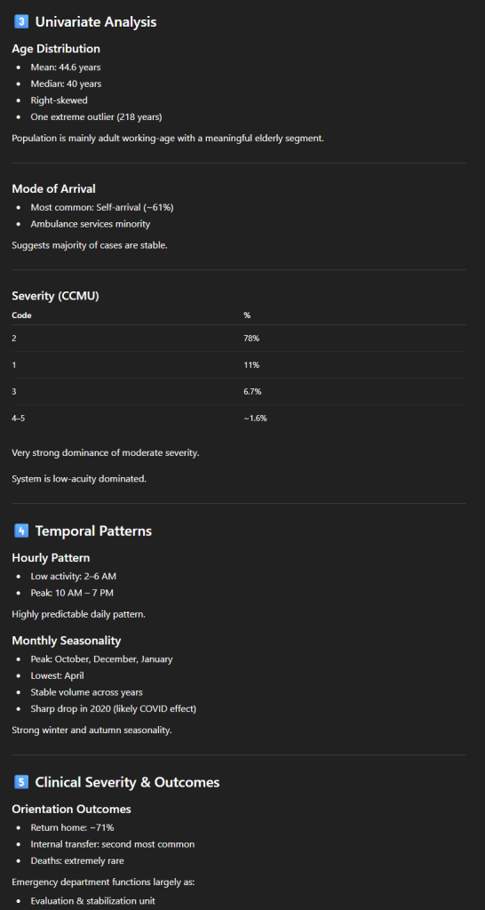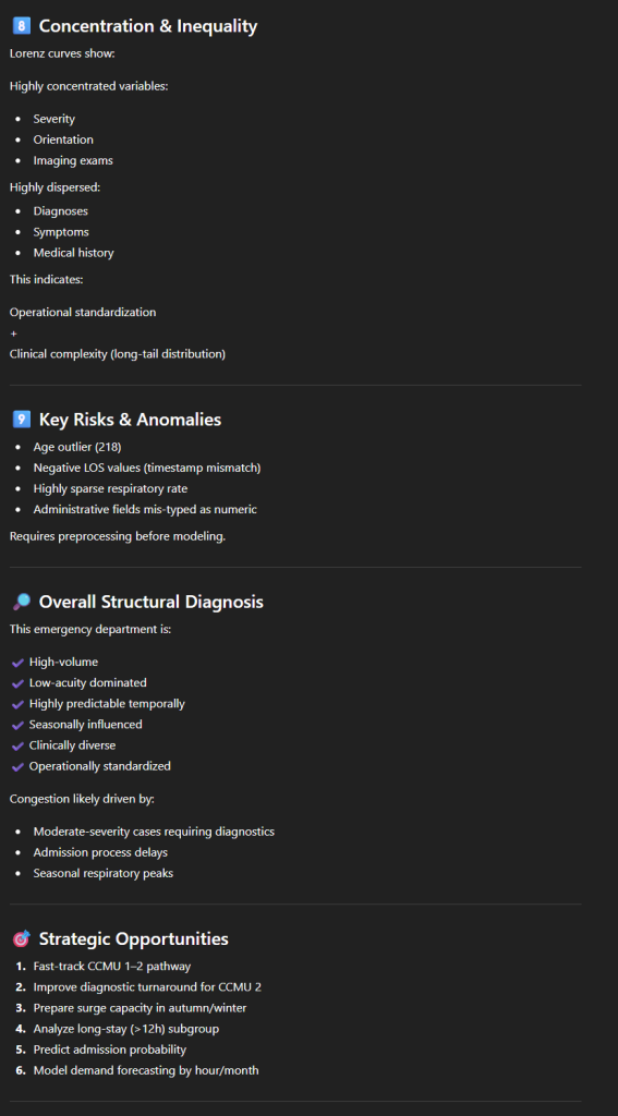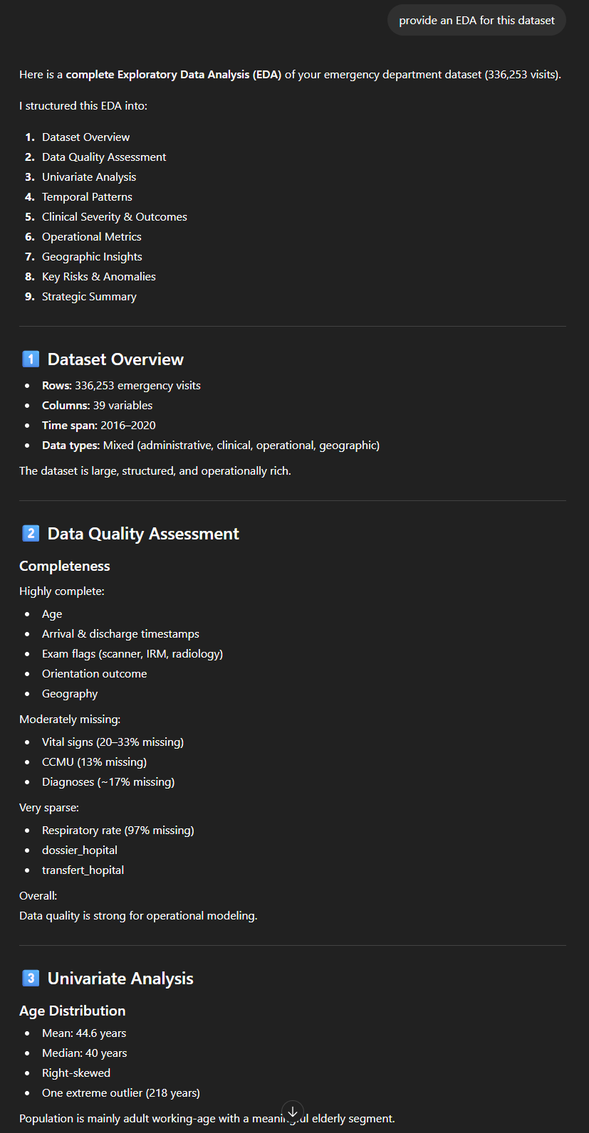 - Une analyse textuelle structurée de ce qu’il a pu comprendre des données. La démographie des patients, quelles sont les heures de pointe, où vont les patients à la sortie et comment sont-ils arrivés ;