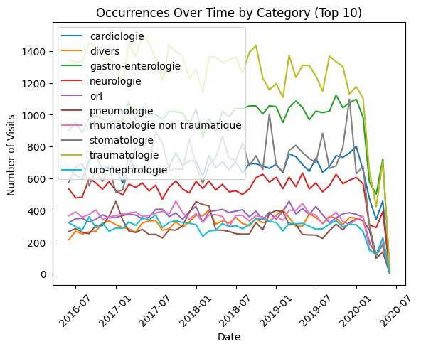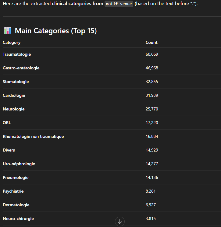 En observant les données, nous avons remarqué deux colonnes concernant la raison d’arrivée du patient : une colonne “motif_entree”, très peu structurée (“Trauma cheville G”, “A avalé une LED avec une pile”…) et une autre “semi-structurée” : “Cardiologie: Douleur thoracique atypique”, “Pneumologie: Dyspnée sans détresse”, “Toxicologie: Alcoolisation/Ivresse aigue”… Il serait intéressant de pouvoir analyser certains éléments en fonction d’une “catégorie” : “Cardiologie”, “Pneumologie”, “Toxicologie”…