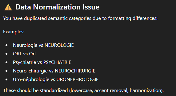 - Lors de l’extraction de la “catégorie”, nous avons demandé, outre la séparation sur base du “:”, de corriger également certains problèmes de qualité (pour par exemple remplacer “Cardiovasculaire” par “Cardiologie” ou “Intoxications” par “Toxicologie”). Les questions qui suivaient de près ce nettoyage considéraient la version la plus élaborée. Mais quelques jours après, quand nous évoquions “cleansed categories”, ChatGPT se contentait de la séparation sur base du “:”,