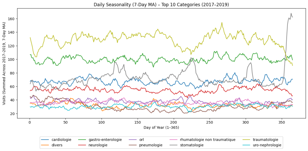 Pour obtenir des tendances saisonnières, on peut demander de sommer les trois années pour lesquelles on a des données entières et de lisser les données, en considérant une moyenne glissante sur 7 jours : “For the top 10 cleansed categories, plot the number of visits per date in year (summing up values for 2017, 2018 and 2019, excluding 2016 and 2020), with a moving average of 7 days“.