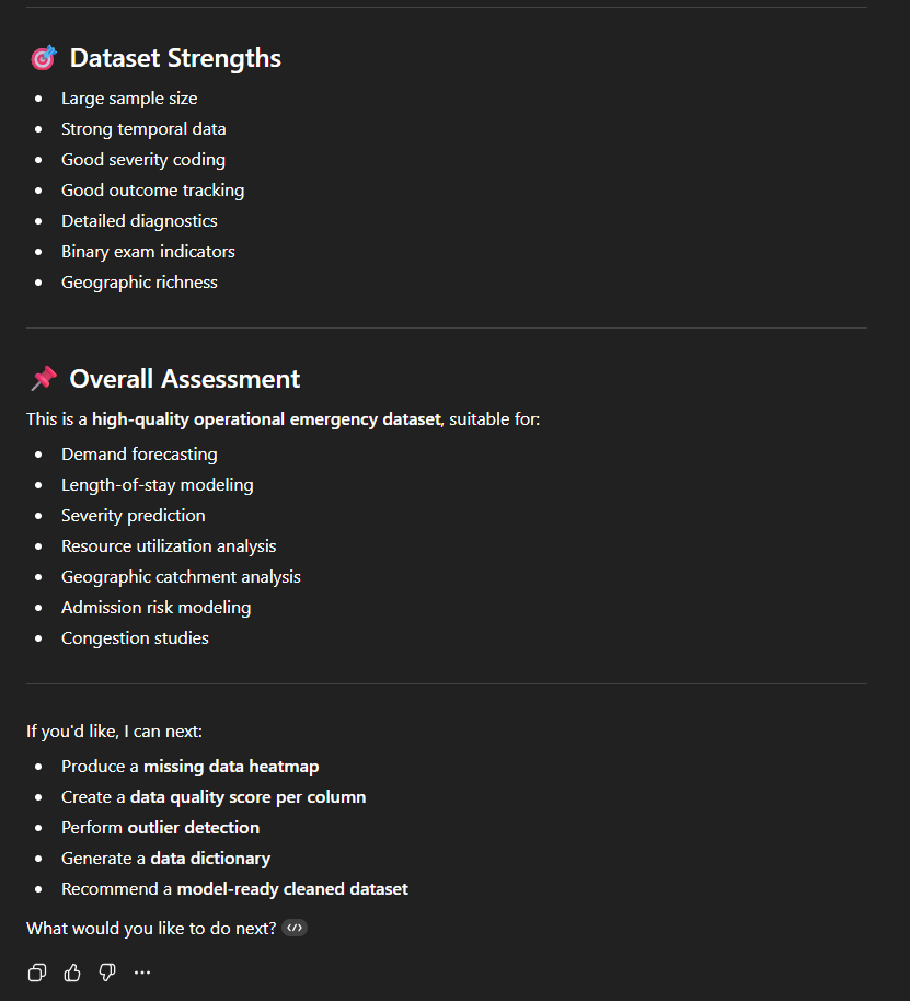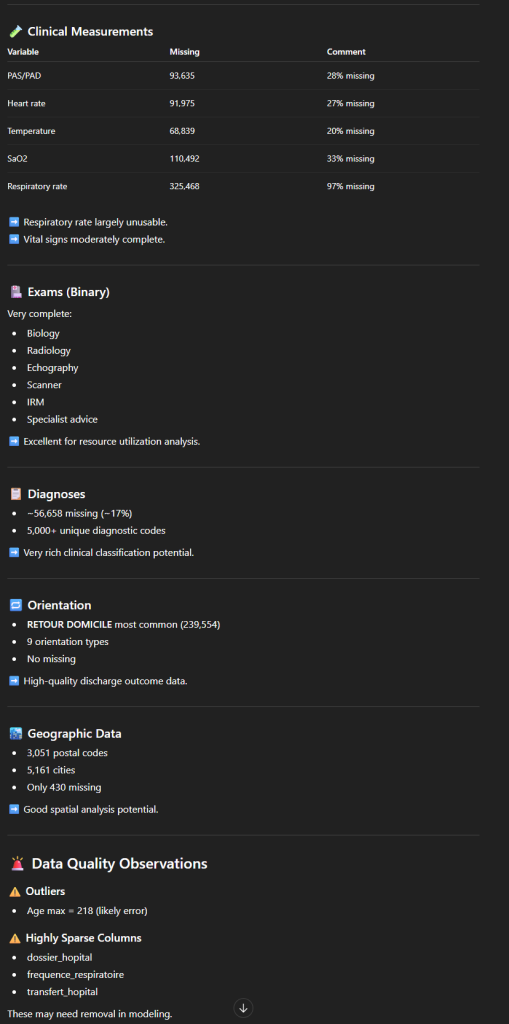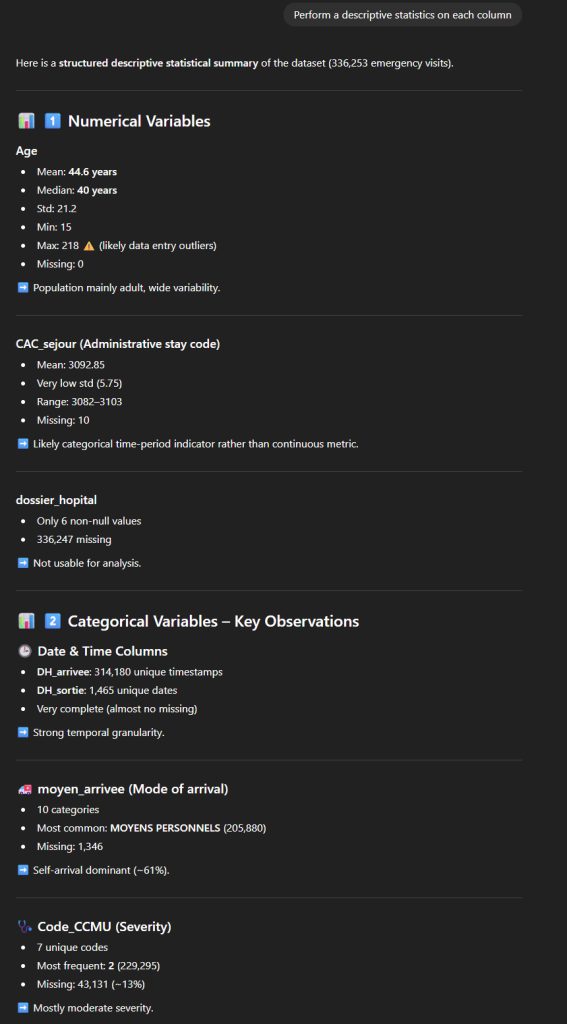 On peut par exemple demande de fournir une description statistique pour chaque colonne. On obtient ici en résultat une longue description très structurée, par type de variable (numérique ou catégorique) avec une série d’indicateurs : moyenne, minimum/maximum, nombre de valeurs manquantes… ainsi qu’un commentaire (“Not usable for analysis“, “Vital signs moderately complete“, “Excellent for resource utilization analysis“, “Likely categorical indicator”…). L’outil nous propose également quelques observations liées à la qualité des données (Exemple : “Outliers: Age max = 218 (likely error)“).