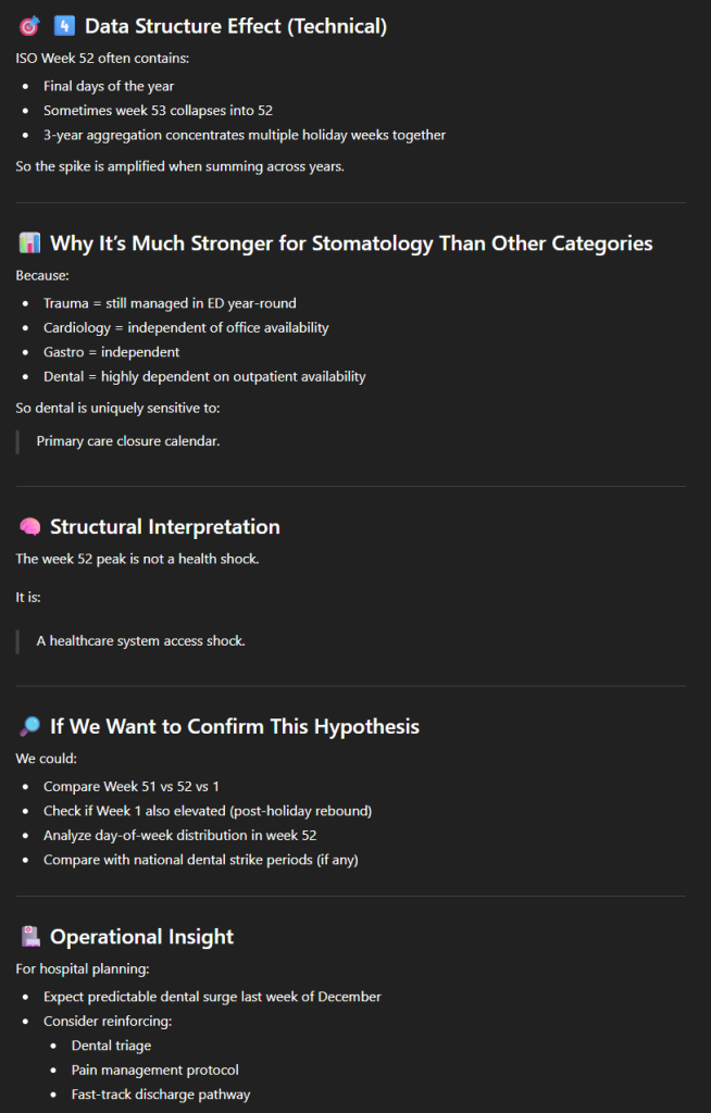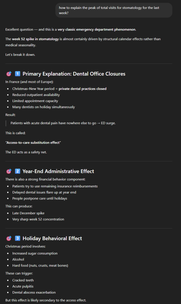 Comme on s’y attendait, on peut observer que les pathologies pulmonaires (en brun) sont plus élevées en hiver qu’en été, mais ce qui est surprenant, c’est cet énorme pic à la toute fin de l’année de la stomatologie. Après s’être assuré que le pic se reproduisait bien tous les ans avec quelques prompts que nous passerons sous silence, nous avons demandé “how to explain the peak of total visits for stomatology for the last week?“. Nous avons été clairement bluffés par la pertinence de la réponse.